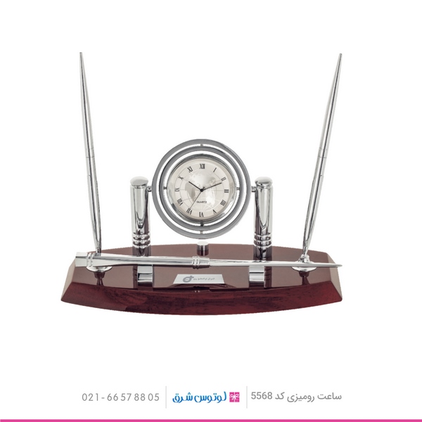 ساعت رومیزی تبلیغاتی کد ۵۵۶۸ از محصولات خاص گروه لوتوس شرق است که جنبه زیبایی و فانتزی بودن آن بسیار مهمتر از کاربردی بودن هدیه تبلیغاتی است. در این محصول همانند سایر ساعت‌های رومیزی پیش بینی چندانی برای قرار دادن برگه یادداشت یا برگه تقویم وجود ندارد. در واقع طراحان ترجیح دادند که تمامی فضای ساعت را به یک ساعت نسبتاً بزرگ و دو خودکار اختصاص دهند که اهداف متفاوتی دارند.